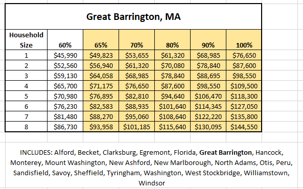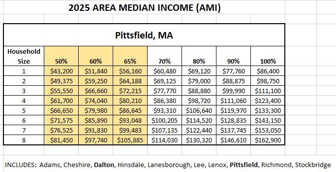 You must be able to obtain a mortgage pre-approval from a third-party lender whose information can be provided by Habitat. Your total household income must also meet the income guidelines of the town in which you are interested in applying for homeownership. These Area Median Income ranges are configured by household size and will vary depending on the town – Pittsfield, Dalton, or Housatonic.